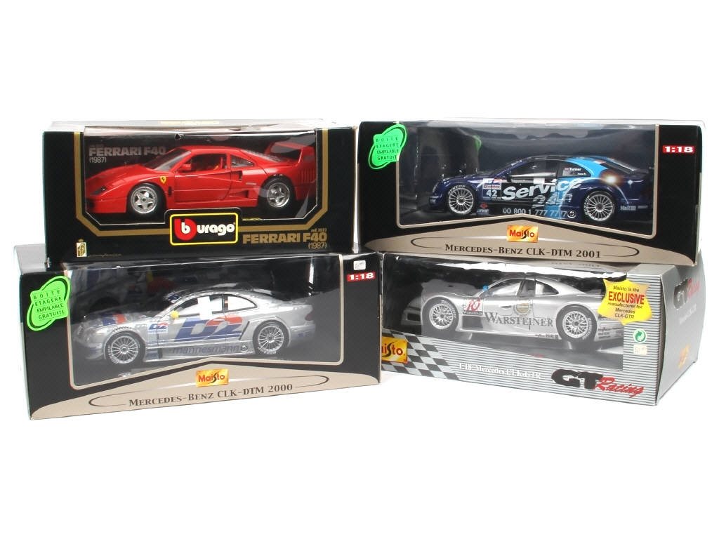 échelle 1/18ème - comprend les modèles : CLK-GTR, DTM 2000 & 2001 - on y joint une FERRARI F40 de la marque BBURAGO - quelques blisters abîmés par endroits