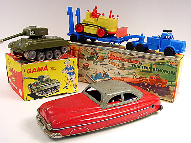 longueur 29,5 cm - moteur à clef (fonctionne) - avec direction - léger enfoncement du pare-chocs & de la carrosserie arrière - traces d'oxydation