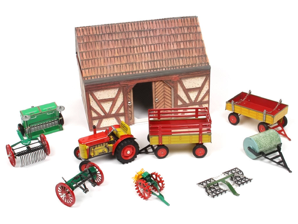 moteur à clef (fonctionne) - comprend : batîment de ferme & 9 matériels agricoles (référence : 391 à 403)