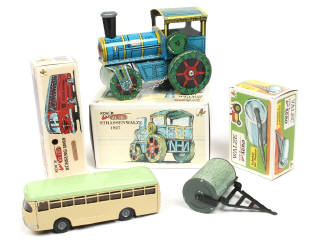 comprend : autobus BÜSSING 1959 & rouleau compresseur 1927 (moteur à clef - fonctionne) avec remorque - quelques accrocs sur les boites