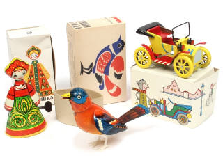 fabrications tchécoslovaque & russe - à clef (un exemplaire avec clef & un autre avec bruiteur) & à ressort - quelques accrocs sur les boites