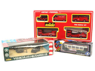 comprend : coffret 'POMPIERS' (référence 7010), bus RENAULT TN6C & coffret 'VEHICULES MILITAIRES' (référence 7025 - possibilité de petits manques - boite en état 'c')