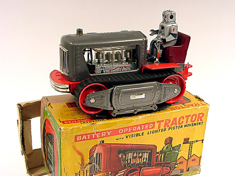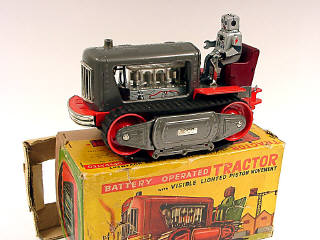 référence 119A du livre de BRIAN MORAN 'BATTERY TOYS' - longueur 25,5 cm - en action, le tracteur avance ou recule tandis que les pistons du moteur bougent & s'éclairent - la courroie de transmission du moteur (non d'origine) entraîne le ventilateur de radiateur - avec cale de boîte & conducteur en forme de robot - chenilles ayant tendance à patiner sur les jantes