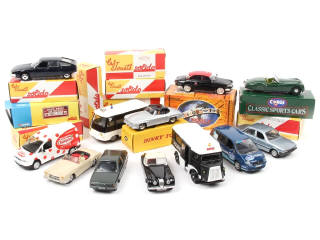 exemplaires majoritairement vendus en kiosque - miniatures reproduisant notamment les modèles : CITROËN, JAGUAR, MERCEDES (exemplaire repeint), PEUGEOT & PANHARD - on y retrouve notamment les marques : CORGI TOYS, SOLIDO & EDITIONS ATLAS - quelques modèles sans boîte - quelques petits accessoires manquants - les boîtes sont en états de 'a' à 'c'