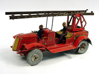 longueur 24,5 cm - moteur à ressort (à revoir) - avec direction - manque un pompier & un autre avec une patte de fixation cassée - version avec cabine ouverte, flasques de roues à trois trous & support d'échelle avec relief aux entretoises - traces d'oxydation notamment sur l'échelle