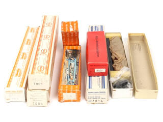 comprend : wagons-marchandises & voitures-voyageurs - on y retrouve les marques : R.M.A., MOUGEL, FRANCETRAINS & AKU MODELLEISENHBAHNEN - 6 modèles à monter - possibilité de manques & parties cassées sur certains exemplaires
