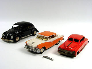 longueur 19,5 cm - moteur à clef (fonctionne) - avec direction - un système intégré aux pare-chocs permet à la voiture lorsqu'elle heurte un obstacle de reculer ou d'avancer tout en changeant de direction - avec clef non d'origine