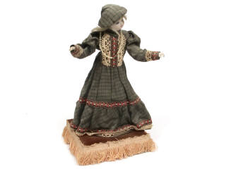 fonctionne - hauteur avec socle : 37 cm - mécanisme à ressort & boîte à musique (2 airs) situés dans le socle - tête & main en biscuit, yeux bleus en verre fixes & bouche fermée - mouvements des bras & de la tête - habits légèrement défraichis