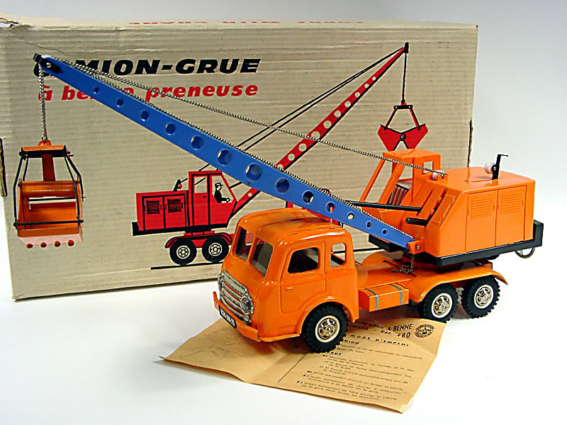 longueur 34 cm - mécanisme à clef (fonctionne) - mécanisme à manivelle pour la grue (fonctionne) - chaînette d'ouverture de la benne à refixer - avec notice