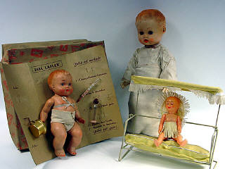 hauteur 38 cm - articulé - yeux mobiles bleus - bouche comportant un orifice pour un biberon - avec bruiteur, barbotteuse & lange