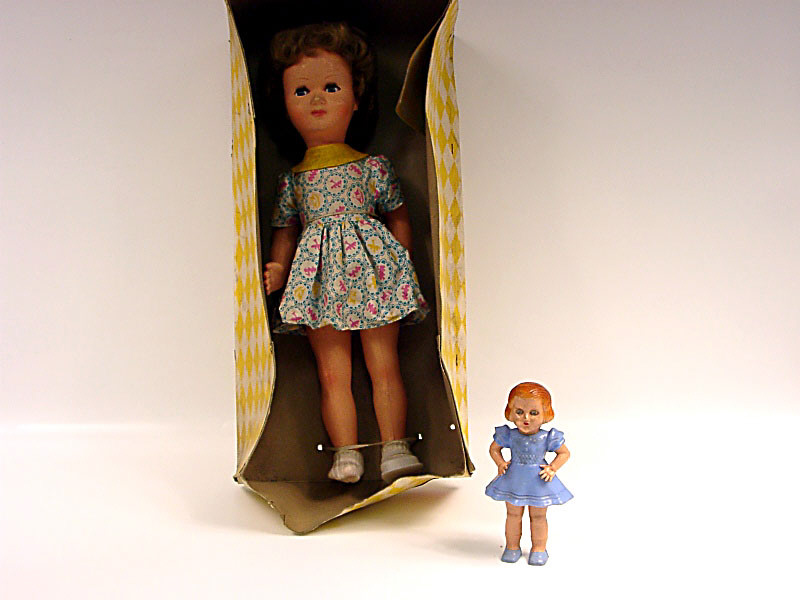hauteur 42 cm - articulée - yeux mobiles bleus - cheveux implantés châtains clairs - avec robe à motifs - manque un soulier & couvercle de boîte - une petite déchirure sur le col