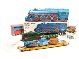 on y retrouve notamment la marque TIN TOYS (moteur à friction & bruiteur - fonctionnent) - les boites sont en état 'b' - on y joint une motrice électrique BB-8051 (non motorisé) & un wagon marchandises de la marque HORNBY FRANCE (état 'B' & 'C' - sans boites)