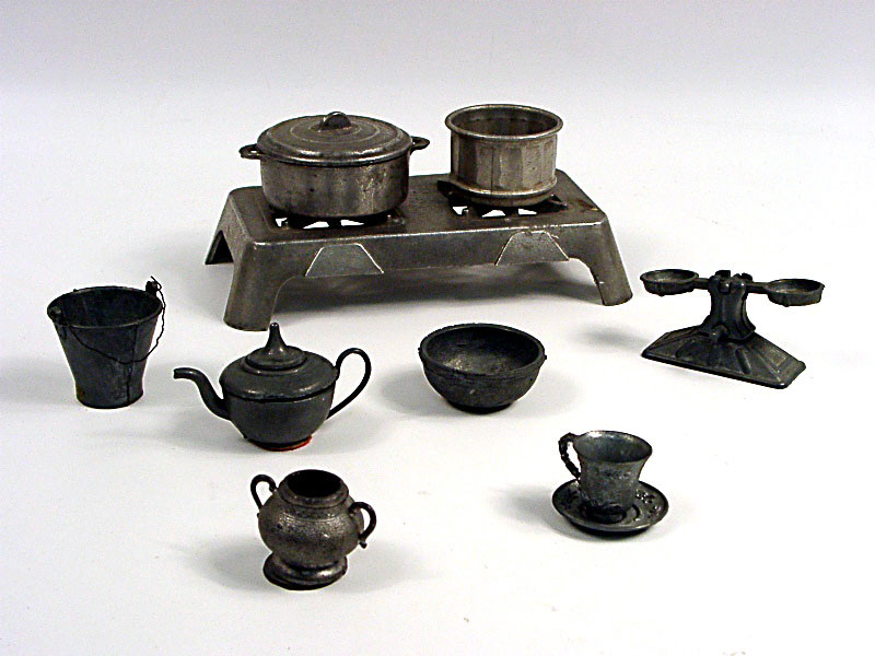 comprend : un réchaud à gaz, une passoire, une balance, une cocotte, un seau, une tasse avec soucoupe, une théière, un sucrier & un bol (en métal fatigue)