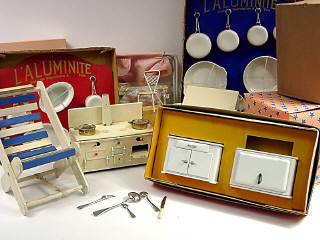 comprend : une chaise en tôle, un gros fauteuil en bois, une cuisinière en tôle peinte, 3 fauteuils transat, une ménagère, 2 ensembles d' éléments de vaisselle en porcelaine, un plan à langer & un ensemble d'éléments de cuisine en tôle peinte - tous ces jouets proviennent d'un fond de magasin