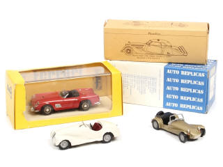 comprend : FERRARI 250 GT 1961, BMW 328 1938 (saute-vent cassé à recoller) & LOTUS SUPER SEVEN 1975 - on y retrouve les marques : IDEA 3, PLUMBIES INTERNATIONAL & AUTO REPLICAS - les boites sont en état 'b' avec petits manques de papier sur 2 exemplaires