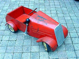 longueur 105 cm - en tôle peinte - avec poire sonore (non d'origine) - direction par le volant - semble complète - quelques traces d'oxydation