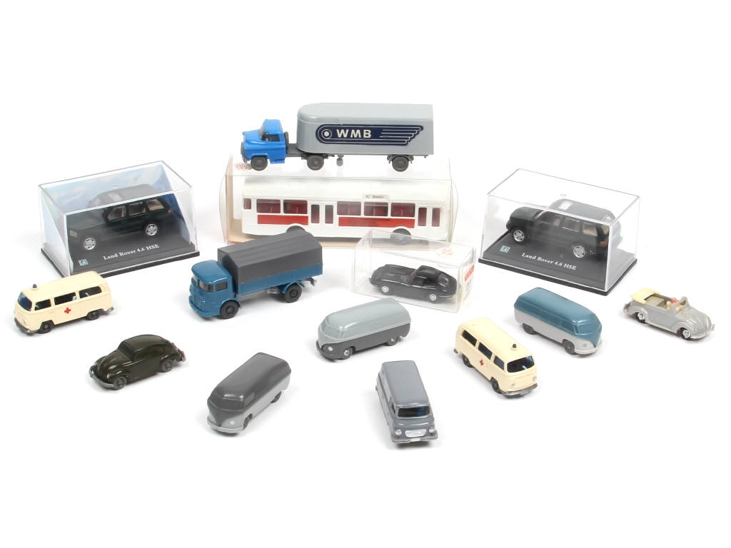on y retrouve notamment les marques : WIKING (majoritairement), EKO & CARARAMA - avec petits manques & parties cassées - 4 modèles en boite état 'b'