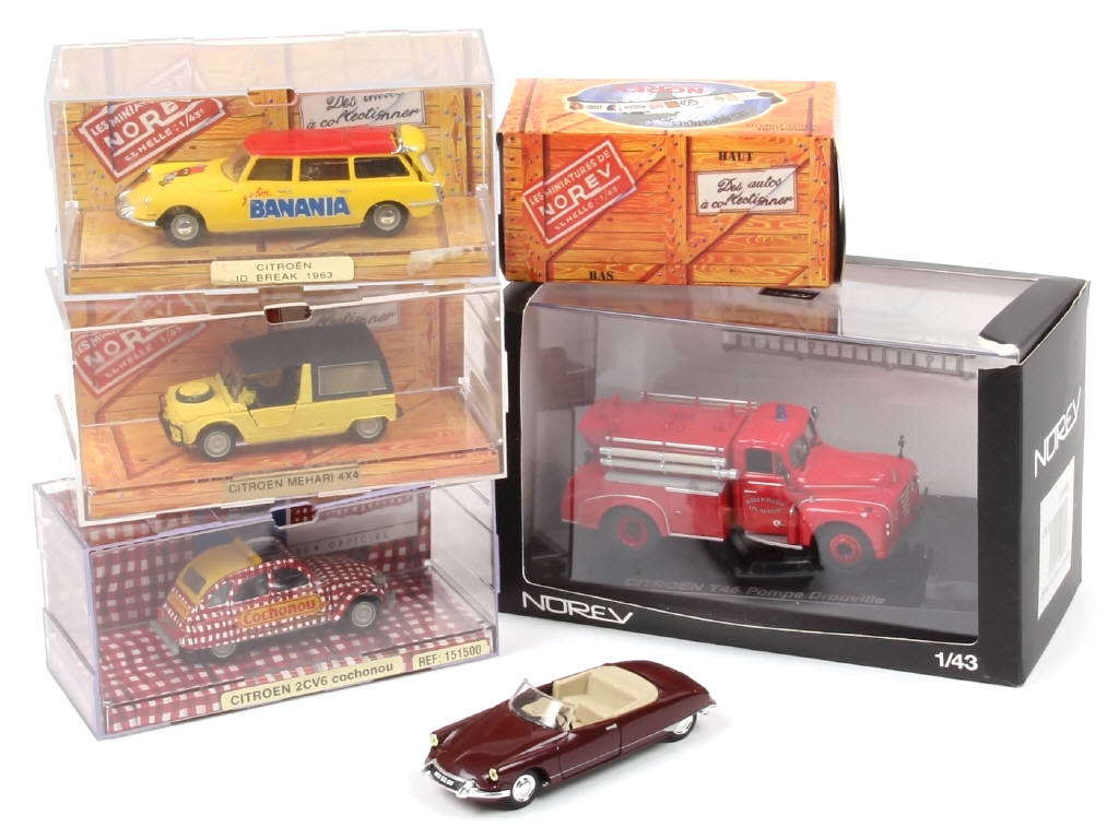 comprend les modèles : T46 auto-pompe de pompiers (suremballage déchiré), 2 cv 'COCHONOU', MEHARI 4x4, ID break 'BANANIA' & DS 19 cabriolet (distribué en kiosque) - 2 exemplaires de la caravane du Tour de France