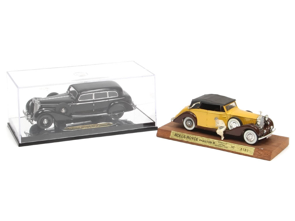 comprend : MERCEDES 770 'GROFER MERCEDES' PULLMAN limousine (SIGNATURE MODELS) & ROLLS ROYCE PHANTOM III (base SOLIDO - sur socle en bois - couvercle manquant)
