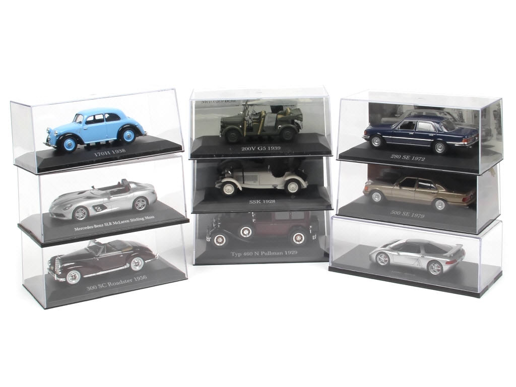 majoritairement vendus en kiosque - comprend notamment les versions : 170H 1938, SLR Mc Laren (MINICHAMPS), SSK 1928, 300 SC 1956, 460 PULLMAN 1929 - on y joint une voiture LOTEC SIRIUS