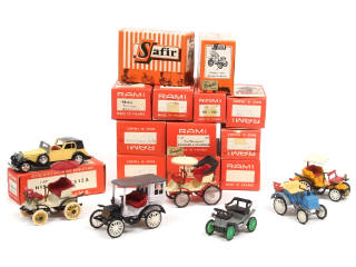 possibilité de petits accessoires manquants - comprend notamment : DELAHAYE, BERLIET, HAUTIER, HISPANO SUIZA & PEUGEOT - les boites sont en état 'b' & 'c' (4 modèles sans) - on y joint 3 modèles de la marque SAFIR