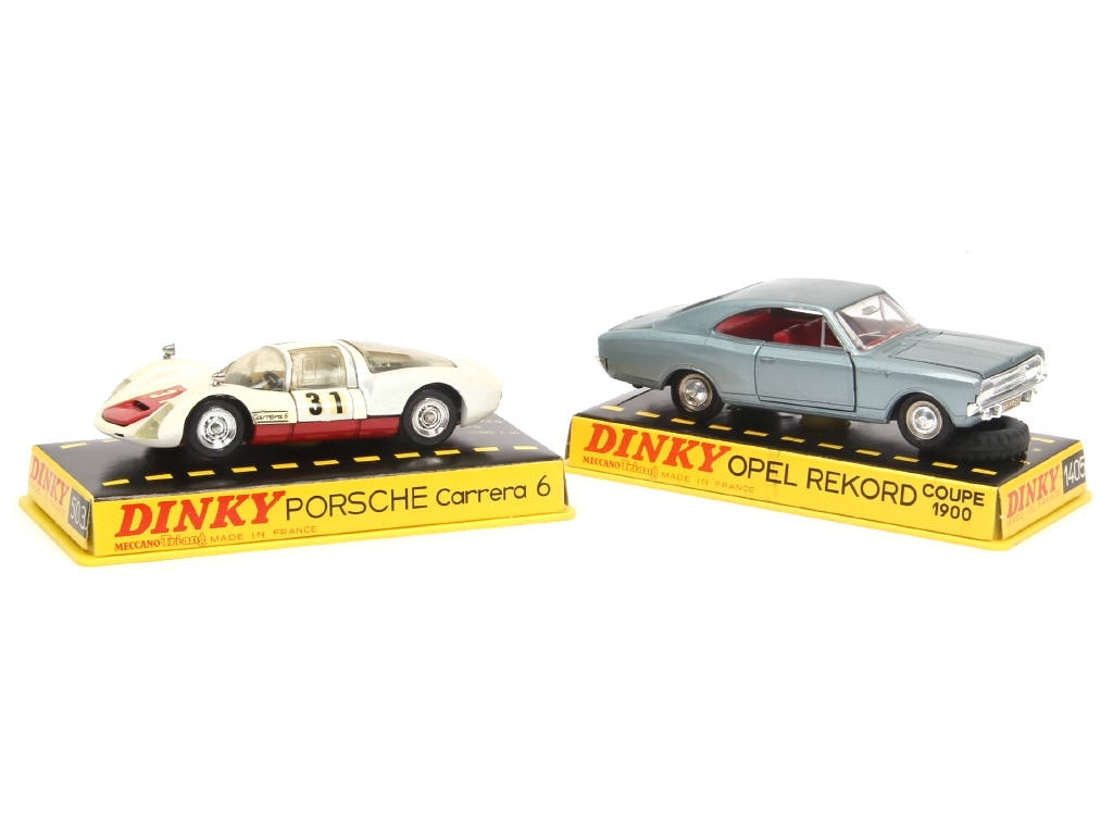 comprend : PORSCHE CARRERA 6 (3 micro-éclats à l'arrière du modèle) & OPEL REKORD coupé 1900 - manque un pneu de maintien