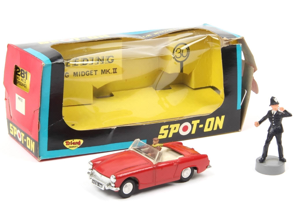 contient : une MG MIDGET MK II avec conducteur (quelques micro-éclats sur la carrosserie par endroits) & un policier britannique - avec cales de boîte