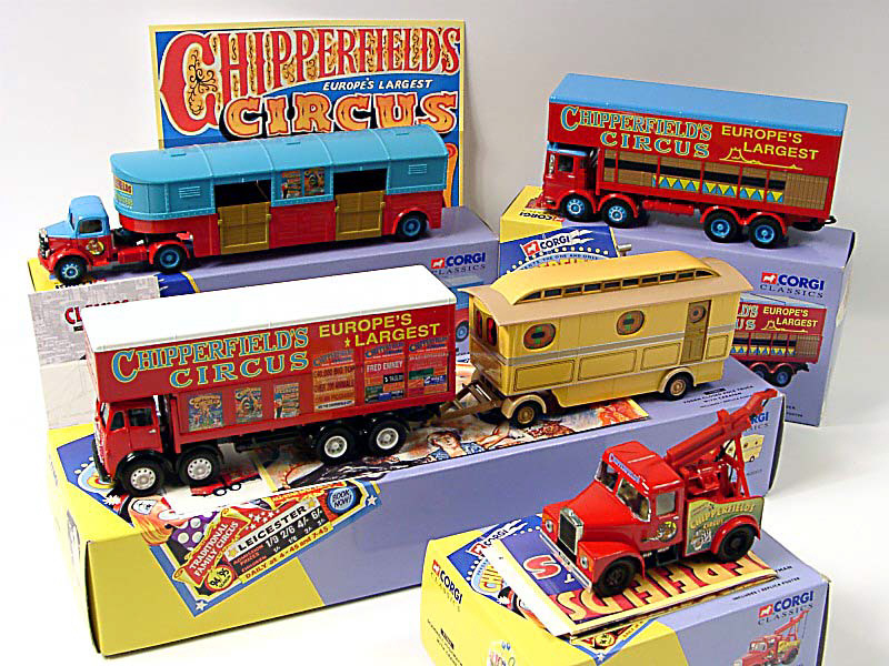 'CHIPPERFIELD'S CIRCUS' - année 94-95 - avec certificat n° 00428/12500 - avec une petite carte de collection 'CHIPPERFIELDS JUGGLERS AND CYCLISTS', un petit dépliant sur la gamme 'CORGI CLASSICS' & un fac-similé en format réduit d'une affiche de la représentation ayant eut lieu à HULL - sachet contenant une grappe d'accessoires