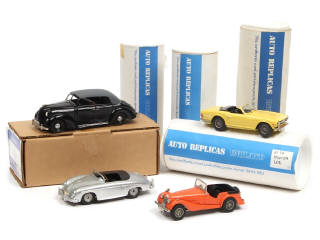 réalisation en métal - comprend les modèles : OPEL, TRIUMPH, MORGAN (2 exemplaires) & PORSCHE - avec manques, parties cassées, déformées ou à recoller - on y retrouve les marques : PLUMBIES & AUTO REPLICAS