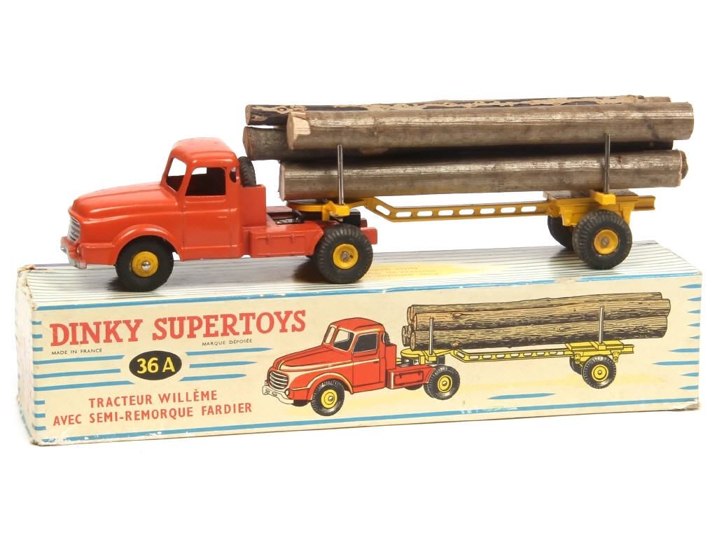 DINKY TOYS (FRANCE) 36A WILLEME Fardier (version avec jantes convexes & remorque ajourée) orange & jaune