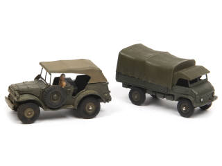comprend : MERCEDES UNIMOG tous terrains (éclats avec oxydation sur l'entourage du pare-brise) & DODGE COMMAND CAR (quelques parties repeintes - avec manques)