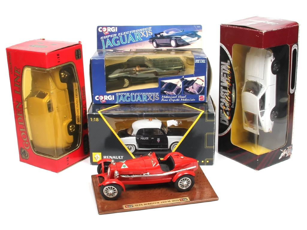 échelle 1/18ème - comprend les modèles : GMC, ALFA ROMEO (sans boite), RENAULT, DATSUN & JAGUAR (avec capote motorisée - non testé) - on y retrouve les marques : BBURAGO, MIRA, CORGI, ROAD SIGNATURE & NOREV - certaines boites en état 'c'