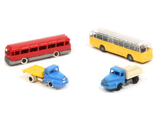 échelle 1/90ème - comprend les modèles : CHAUSSON (légères déformation à l'avant du modèle - quelques petits défaut sur le toit) & UNIC (légères traces de colle sur un exemplaire & un autre sans chargement) - on y joint un autocar panoramique de la marque WIKING