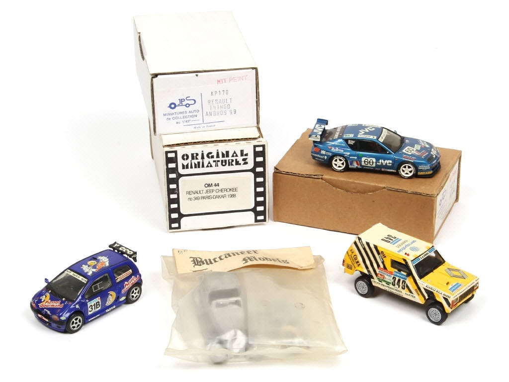 3 kits montés en résine & un autre en métal (à monter) - comprend notamment le modèle RENAULT - on y retrouve les marques : JPS (dont un exemplaire Le Mans), ORIGINAL MINIATURES & BUCCANEER MODELS (édition limitée)