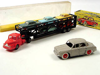 échelle 1:86 - avec son chargement de 5 véhicules (3 SIMCA VERSAILLES & 2 CITROËN DS 19) - manque roue de secours du tracteur - les 5 voitures sont des modèles lestés