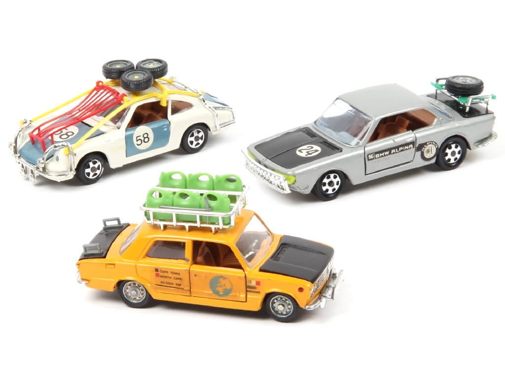 comprend : PORSCHE 912 (état 'A', très légers manques de pellicule chromée par endroits), BMW (état 'B', suspension avant affaissée, pare-brise fêlé) & FIAT 124 (état 'C')