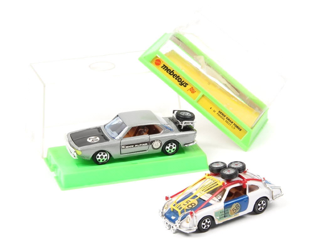 comprend : BMW 2800 ALPINA (manque 2 outils) & PORSCHE 912 (quelques manques sur les décalques, suspensions affaissées, barres de protection plus ou moins déformées) - les boîtes sont en états 'b' & 'd'
