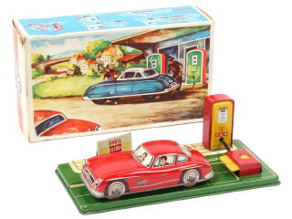 WAMOO (FRANCE) Poste de ravitaillement 'SHELL ICA' avec MERCEDES 190 SL coupé en tôle lithographiée rouge, jaune, vert & blanc cassé