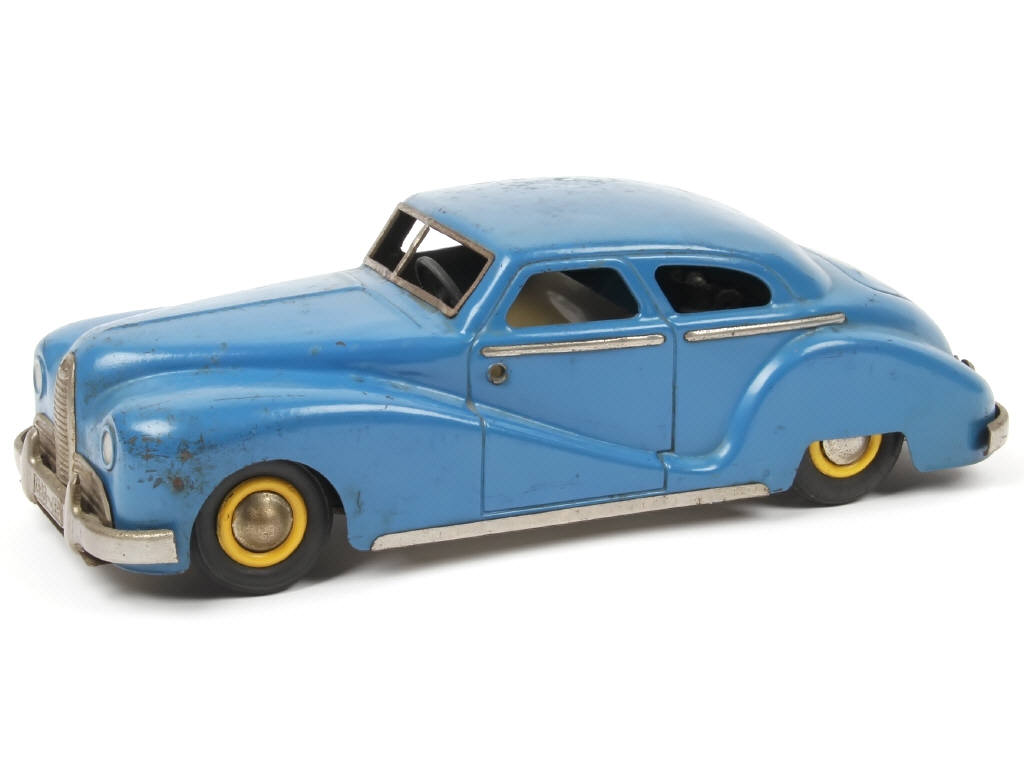 longueur 34 cm - avec moteur à clef (fonctionne) & direction - version sans phares électriques - traces de vernis sur la carrosserie par endroits - quelques restaurations (notamment une portière non d'origine) & petits manques (notamment une poignée) - pneus plus ou moins séchés & craquelés - petites traces d'oxydation