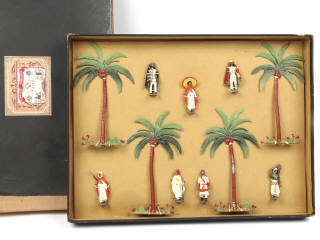 dimensions du coffret : 41 x 31 cm (avec restaurations & papiers collés) - états de 'B' à 'C' - contient : 7 figurines (avec quelques retouches) & 4 palmiers (manques de peinture plus ou moins importants suivant les exemplaires) - ensemble fixé sur socle cartonné avec ficelles de maintien (non d'origine) - possibilité de boîtage non conforme