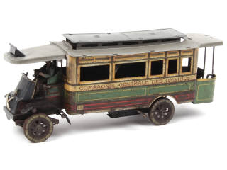 version sans panonceau de toit latéral - il s'agit du premier autobus créé par la marque en 1911 - longueur 29 cm - avec moteur à ressort (fonctionne) & direction - modèle restauré avec parties repeintes, non d'origine & transformées - importantes traces d'oxydation