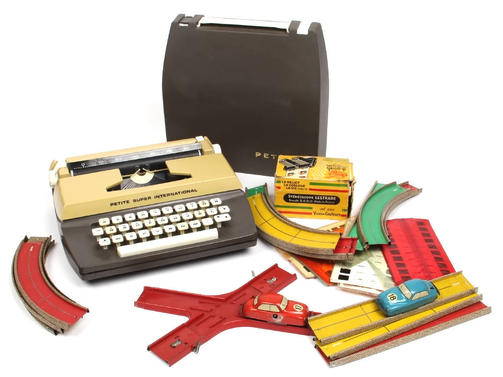 comprend : machine à écrire 'LA PETITE' (une petite partie cassée sur le couvercle), stéréoscope (avec 15 cartes diverses - boite en état 'd') & circuit en tôle (2 voitures à clef - fonctionnent - 4 rails droits & 10 rails courbes) - on y retrouve les marques : JOUEF, BYRON JARDINE & LESTRADE