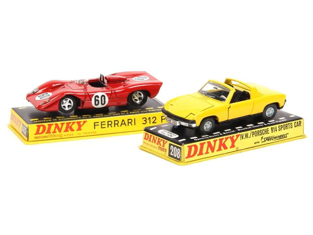 comprend : VOLKSWAGEN PORSCHE 914 (GB) & FERRARI 312 P (FRANCE - avec pneu de socle & fixation) - boite en état 'b' dont une avec fêlure sur le couvercle
