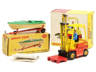 comprend : CONVEYANCER chariot à fourche (complet avec accessoires, cale de boite & notices) & HEALEY SPORTS BOAT TRAILER - quelques micro-éclats par endroits - la remorque est en état 'B' (un éclat majeur sur l'attelage)