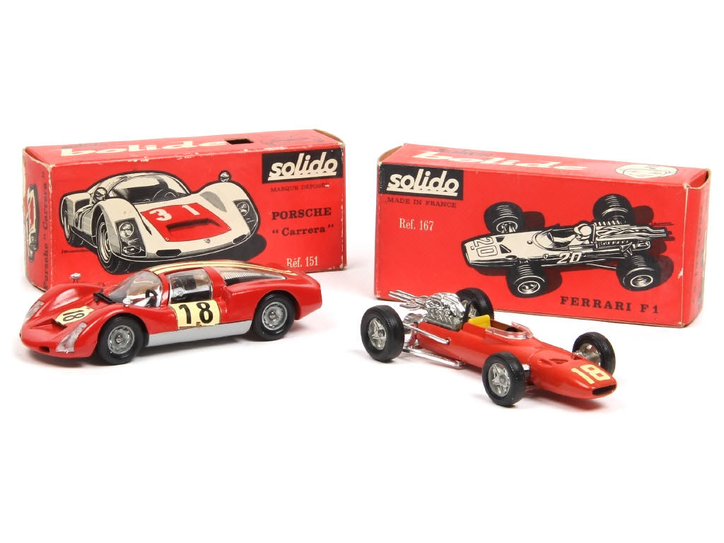 comprend : FERRARI V12 F1 (n°18 - sans pilote) & PORSCHE CARRERA - boites en état 'b' (légers manques de papier)
