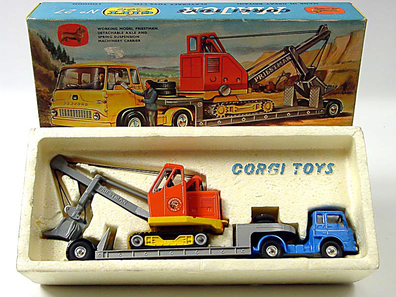 CORGI TOYS (GB) GS27 BEDFORD TK Semi-remorque plateau surbaissé avec pelleteuse PRIESTMAN bleu ciel, gris métal, jaune d'or & orange