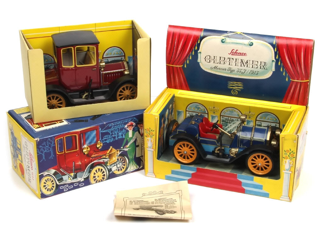 longueur 17 cm - moteurs à clef dont le mouvement imite le tremblement des tacots (fonctionnent) - avec clefs - comprend : MERCER 35J 1913 & FORD T coupé 1917 - quelques légers frottements par endroits - petits accrocs sur les boites
