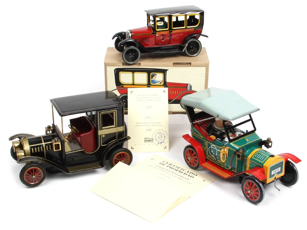 longueur moyenne 18 cm - avec moteur à ressort (fonctionne - fabrication contemporaine d'un modèle des années 20 - avec certificats d'authenticité & de propriété numérotés 3470/5000 exemplaires) & moteurs à piles (à revoir) - un exemplaire avec plancher repeint & détails de peinture ajoutés - on y retrouve notamment les marques : YONEZAWA TOYS & PAYA - une boite en état 'a'