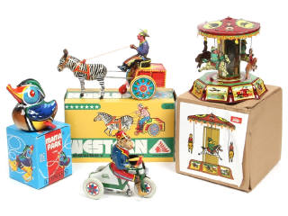 productions récentes - avec moteurs à clef (fonctionnent) - petites traces de colle & d'humidité à l'arrière d'un modèle - on y retrouve notamment les marques :PAYA & LEHMANN - un exemplaire en boite (déformée)
