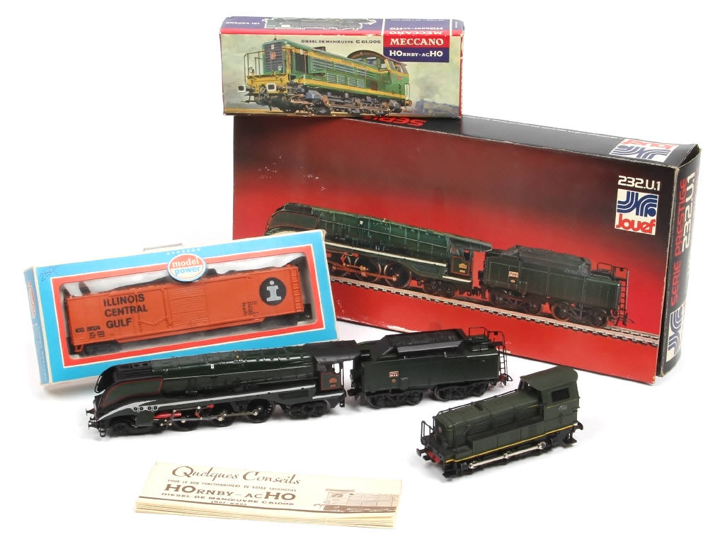 non testé - comprend : locomotive à vapeur type 232.U.1 avec tender (manque cale de boite), wagon marchandises 'ILLINOIS CENTRAL GULF' & motrice diesel type C 61006 (manque un tampon & moteur - carrosserie désolidarisée du plancher) - on y retrouve les marques : HORNBY, JOUEF & MODEL POWER (fabriqué en YOUGOSLAVIE)